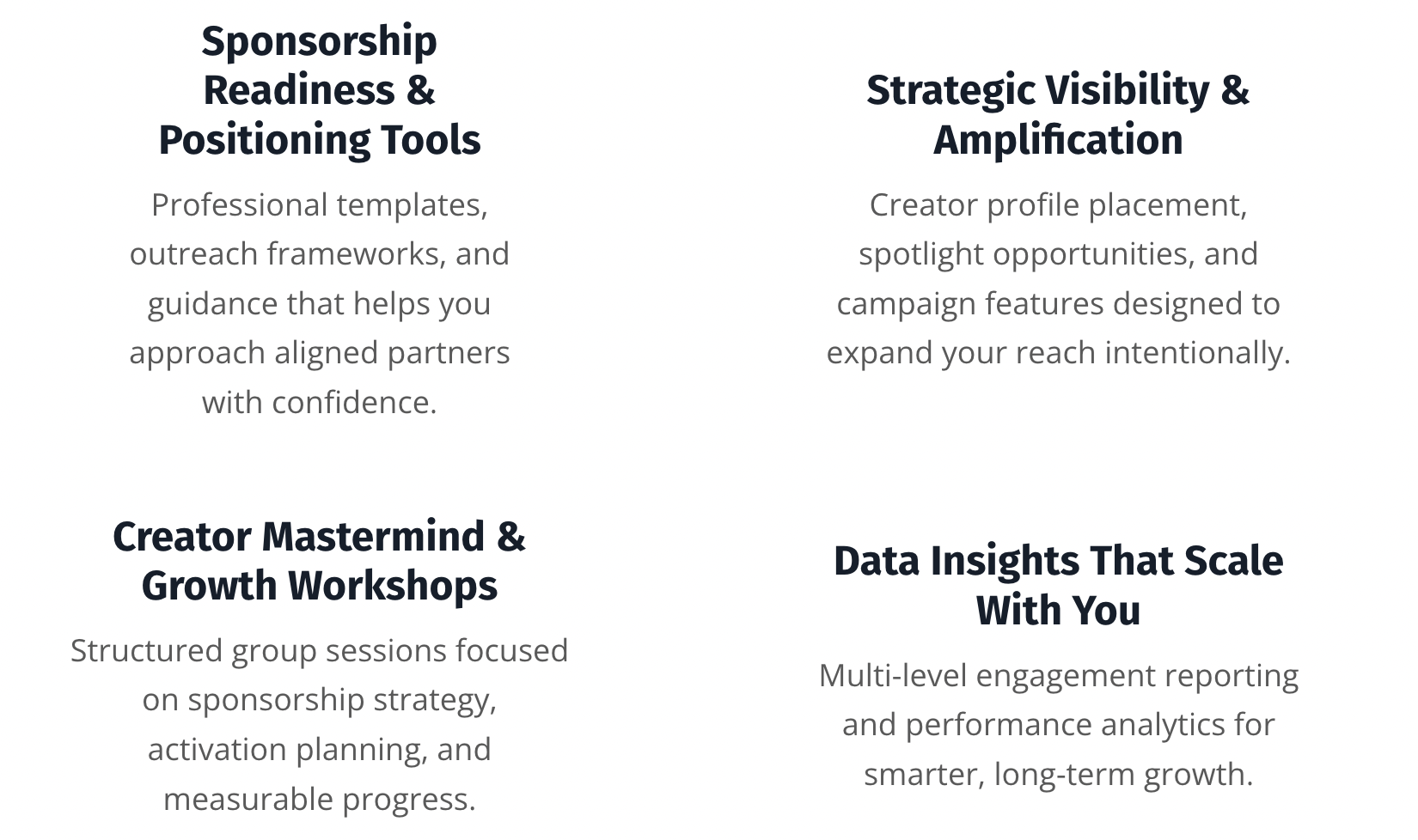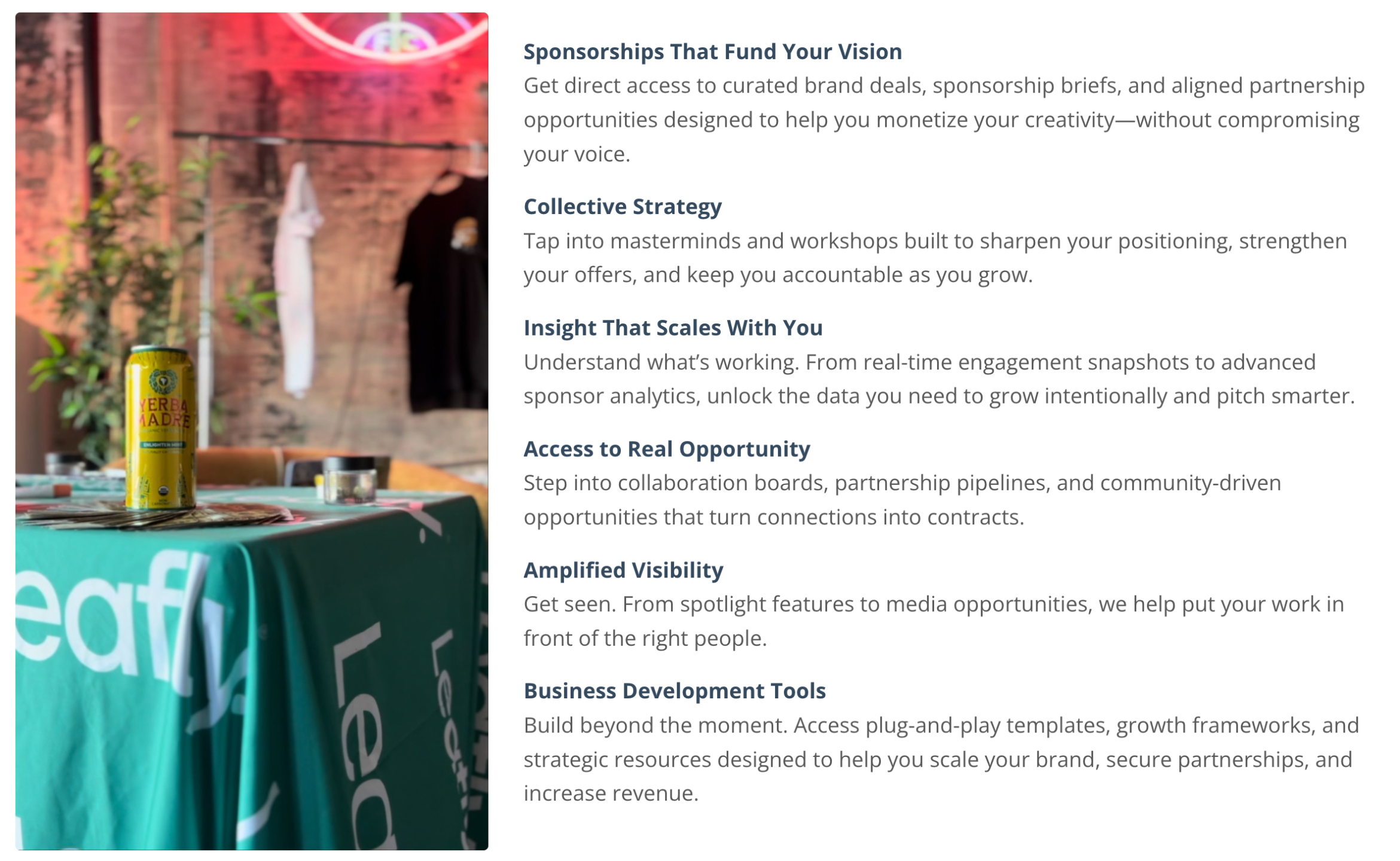 Whether you’re just getting started, building sponsorship momentum, or activating large-scale events and campaigns, our Creator ecosystem gives you clarity, data, visibility, and strategic support to grow with intention.